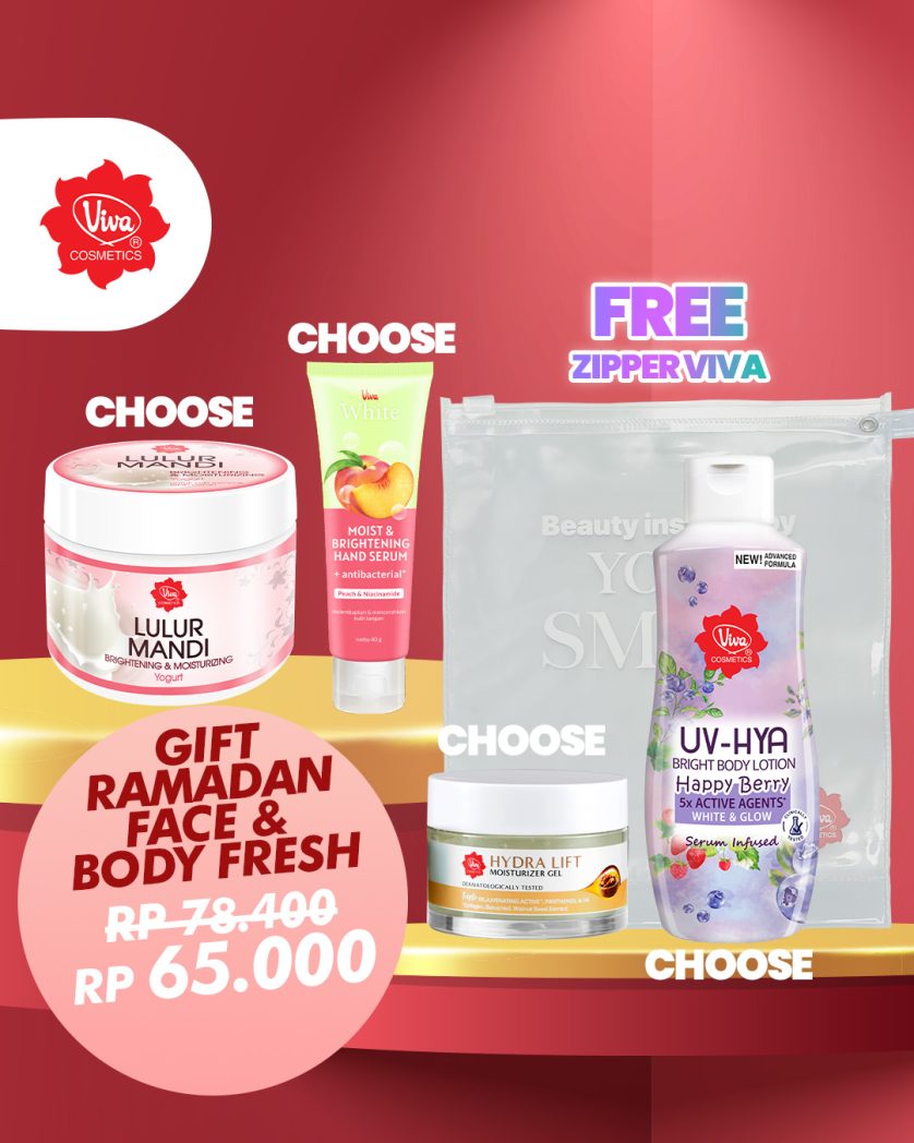 1 Viva Lulur Mandi (bisa pilih varian) 1 Viva HBL UV HYA (bisa pilih varian) 1 VW Hand Serum (bisa pilih varian) 1 Viva Moisturizer Gel (bisa pilih varian)